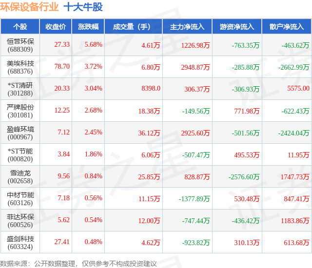 个股表现方面,环保设备行业当日领涨股为恒誉环保(688309),该股当日报收27.33,上涨5.68%,成交量4.61万,主力资金净流入1226.98万元。美埃科技(688376)以上涨3.72%紧随其后,该股当日成交量6.8万,主力资金净流入2948.87万元。除此之外,*ST清研(301288)、严牌股份(301081)、盈峰环境(000967)均进入当日牛股之列。具体个股列表见下表: