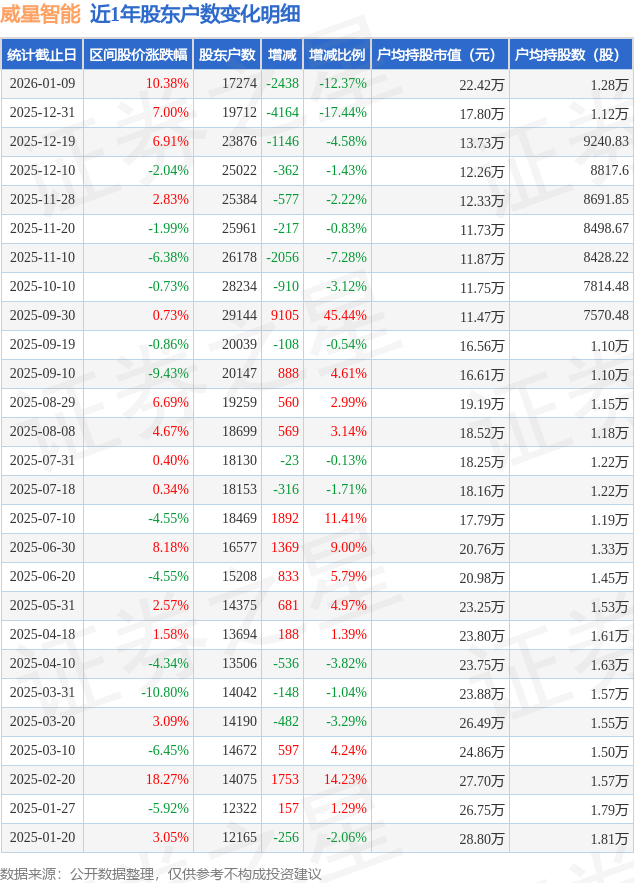 从股价来看,2025年12月31日至2026年1月9日,威星智能区间涨幅为10.38%,在此期间股东户数减少2438.0户,减幅为12.37%。