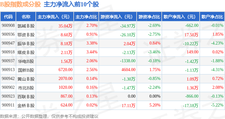资金流向方面,B股指数(000003)成份股当日主力资金净流出合计8.41万元,游资资金净流出合计40.52万元,散户资金净流入合计48.93万元。成份股资金流向详情见下表:
