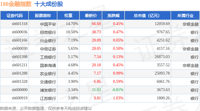 证券之星消息,1月20日,180金融(000018)指数报收于5739.46点,涨0.65%,成交508.27亿元,换手率0.3%。当日该指数成份股中,上涨的有39家,成都银行以3.1%的涨幅领涨,下跌的有4家,浦发银行以0.81%的跌幅领跌。