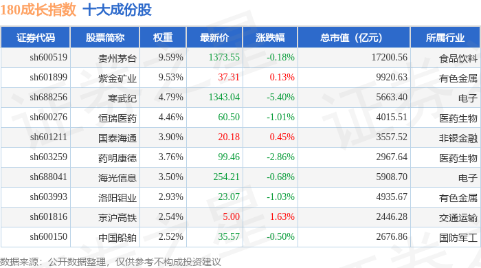 证券之星消息,1月20日,180成长(000028)指数报收于4143.09点,跌0.25%,成交1569.38亿元,换手率1.02%。当日该指数成份股中,上涨的有34家,华鲁恒升以4.54%的涨幅领涨,下跌的有26家,寒武纪以5.4%的跌幅领跌。