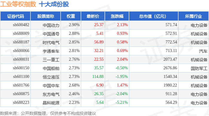 工业等权(000072)指数十大成份股详情如下: