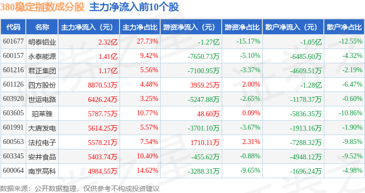 资金流向方面,380稳定(000142)指数成份股当日主力资金净流出合计18.68亿元,游资资金净流入合计5.73亿元,散户资金净流入合计12.95亿元。成份股资金流向详情见下表: