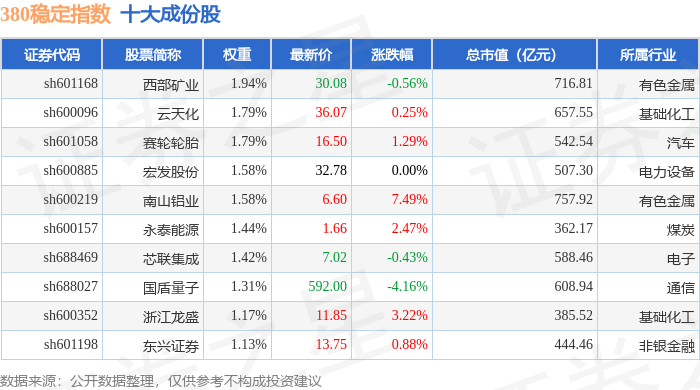 证券之星消息,1月20日,380稳定(000142)指数报收于10604.21点,涨0.76%,成交968.26亿元,换手率1.94%。当日该指数成份股中,上涨的有129家,明泰铝业以9.99%的涨幅领涨,下跌的有58家,金宏气体以4.82%的跌幅领跌。