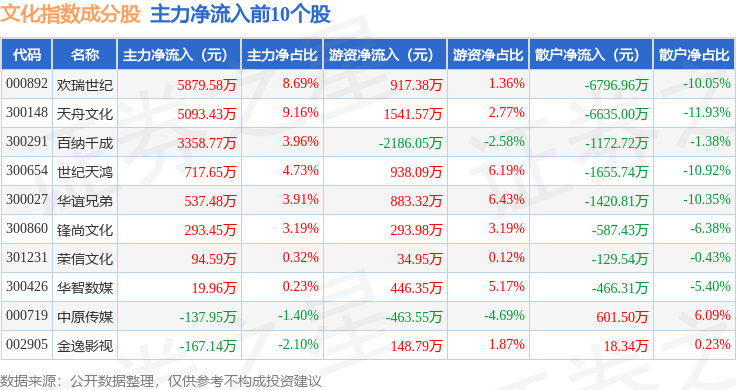 资金流向方面,文化指数(399248)成份股当日主力资金净流出合计2.55亿元,游资资金净流入合计2.98亿元,散户资金净流出合计4269.3万元。成份股资金流向详情见下表: