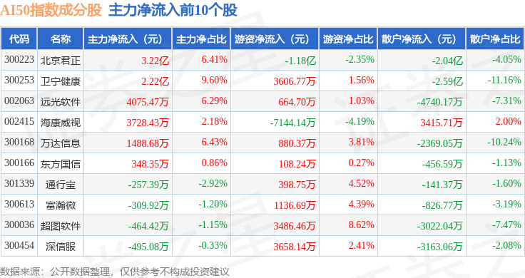 资金流向方面,AI50(399284)指数成份股当日主力资金净流出合计59.82亿元,游资资金净流入合计14.96亿元,散户资金净流入合计44.86亿元。成份股资金流向详情见下表: