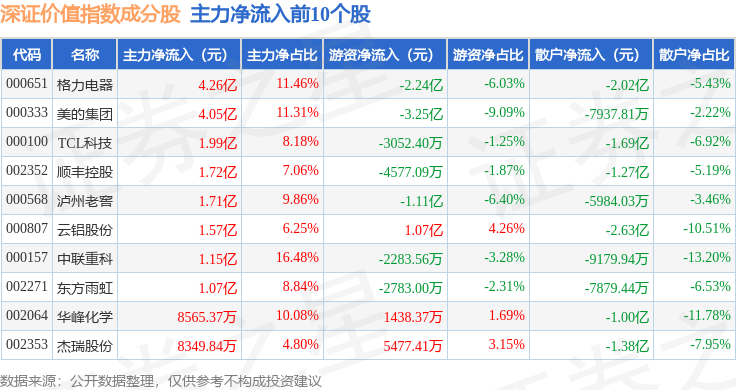 资金流向方面,深证价值(399348)指数成份股当日主力资金净流出合计37.67亿元,游资资金净流入合计4.31亿元,散户资金净流入合计33.36亿元。成份股资金流向详情见下表: