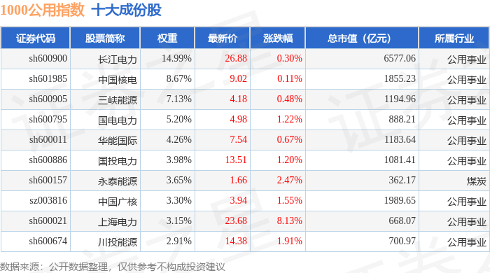 证券之星消息,1月20日,1000公用(399390)指数报收于2701.4点,涨1.16%,成交283.25亿元,换手率1.19%。当日该指数成份股中,上涨的有38家,上海电力以8.13%的涨幅领涨,下跌的有6家,协鑫能科以1.33%的跌幅领跌。
