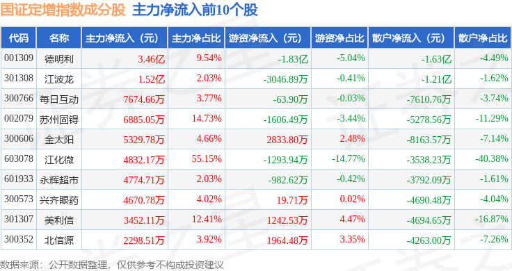 资金流向方面,国证定增(399428)指数成份股当日主力资金净流出合计42.85亿元,游资资金净流入合计11.26亿元,散户资金净流入合计31.59亿元。成份股资金流向详情见下表: