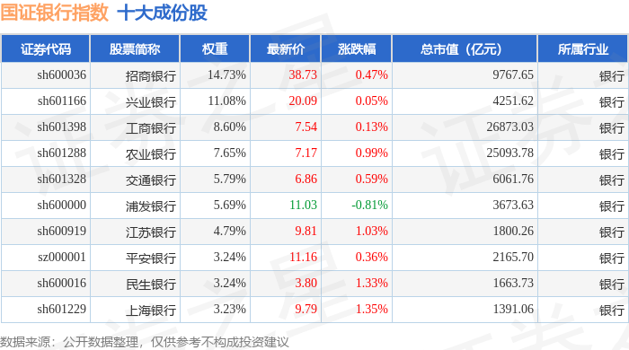 国证银行(399431)指数十大成份股详情如下: