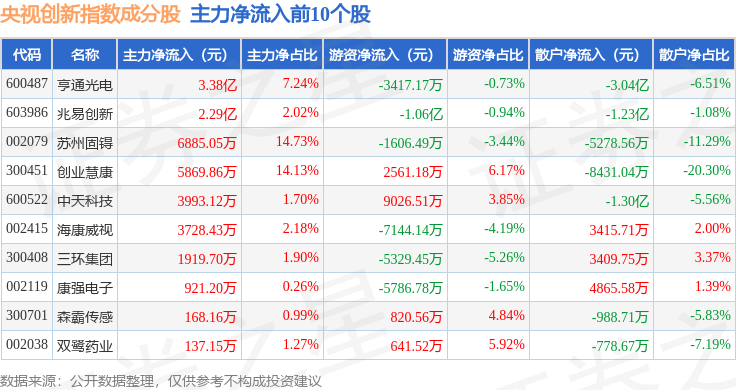 资金流向方面,央视创新(399551)指数成份股当日主力资金净流出合计57.8亿元,游资资金净流入合计7.06亿元,散户资金净流入合计50.74亿元。成份股资金流向详情见下表: