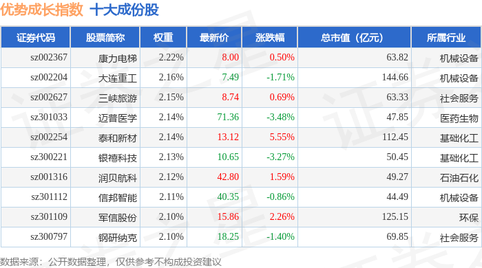 证券之星消息,1月20日,优势成长(399698)指数报收于56040.13点,涨0.34%,成交122.94亿元,换手率4.39%。当日该指数成份股中,上涨的有25家,我爱我家以7.33%的涨幅领涨,下跌的有23家,迈普医学以3.48%的跌幅领跌。