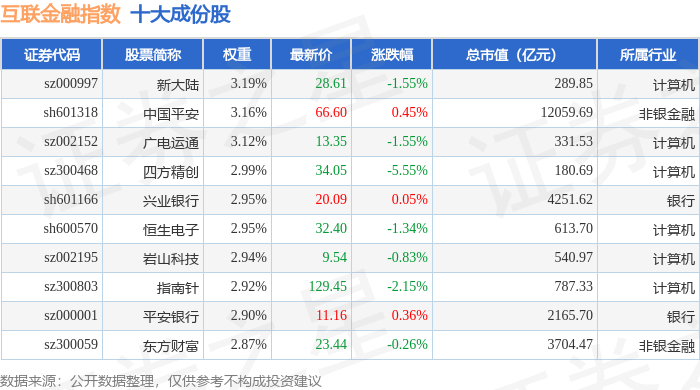 互联金融(399805)指数十大成份股详情如下: