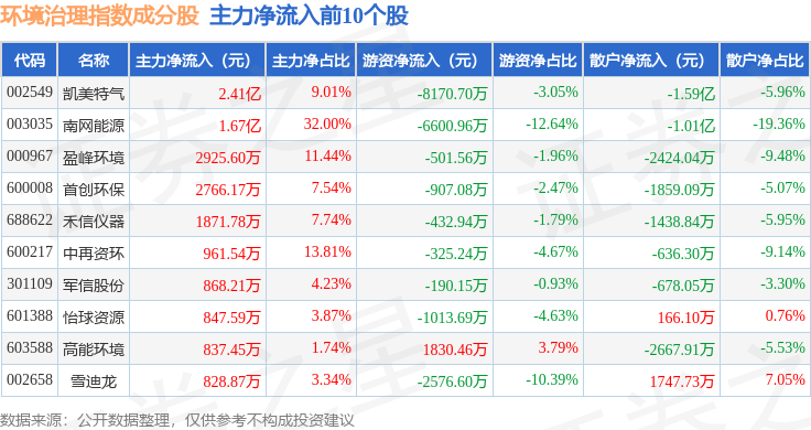 资金流向方面,环境治理(399806)指数成份股当日主力资金净流出合计4.7亿元,游资资金净流出合计9552.14万元,散户资金净流入合计5.65亿元。成份股资金流向详情见下表: