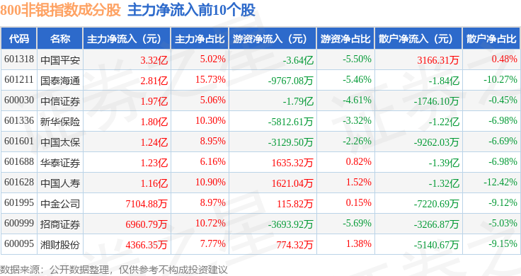 资金流向方面,800非银(399966)指数成份股当日主力资金净流入合计12.88亿元,游资资金净流出合计6.0亿元,散户资金净流出合计6.88亿元。成份股资金流向详情见下表: