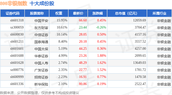 证券之星消息,1月20日,800非银(399966)指数报收于6620.81点,涨0.48%,成交420.56亿元,换手率0.79%。当日该指数成份股中,上涨的有38家,东吴证券以2.31%的涨幅领涨,下跌的有9家,国盛证券以1.45%的跌幅领跌。