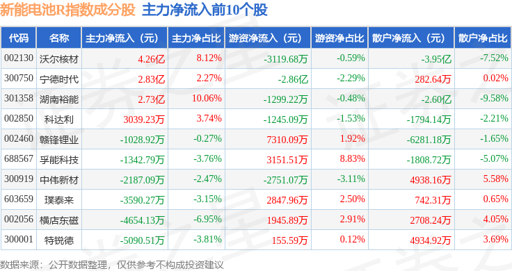 资金流向方面,新能电池R(480032)指数成份股当日主力资金净流出合计57.13亿元,游资资金净流入合计12.44亿元,散户资金净流入合计43.92亿元。成份股资金流向详情见下表: