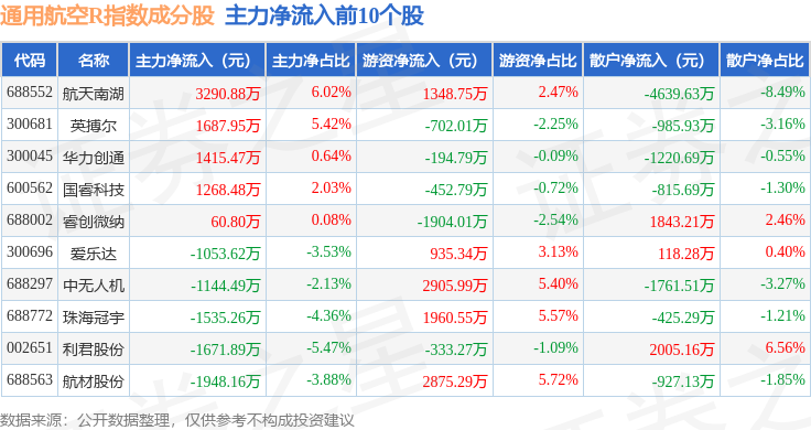 资金流向方面,通用航空R(480076)指数成份股当日主力资金净流出合计75.88亿元,游资资金净流入合计14.37亿元,散户资金净流入合计61.52亿元。成份股资金流向详情见下表: