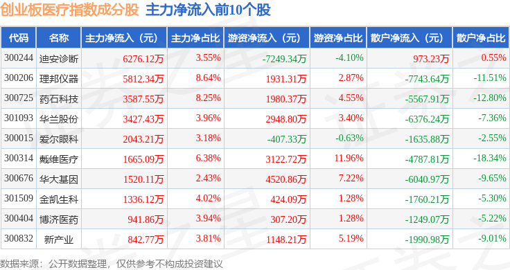 资金流向方面,创业板医疗(970082)指数成份股当日主力资金净流出合计6.51亿元,游资资金净流入合计3.94亿元,散户资金净流入合计2.56亿元。成份股资金流向详情见下表: