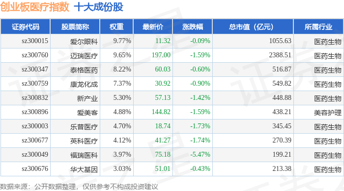 创业板医疗(970082)指数十大成份股详情如下: