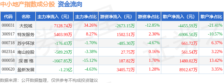 资金流向方面,中小地产(971002)指数成份股当日主力资金净流出合计2219.22万元,游资资金净流入合计1965.36万元,散户资金净流入合计253.86万元。成份股资金流向详情见下表: