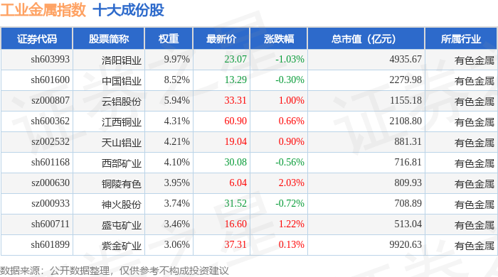 工业金属(980043)指数十大成份股详情如下: