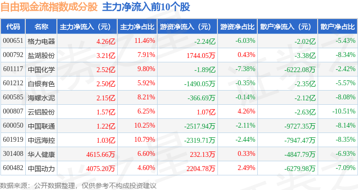 资金流向方面,自由现金流(980092)指数成份股当日主力资金净流出合计4.75亿元,游资资金净流入合计2.07亿元,散户资金净流入合计2.68亿元。成份股资金流向详情见下表: