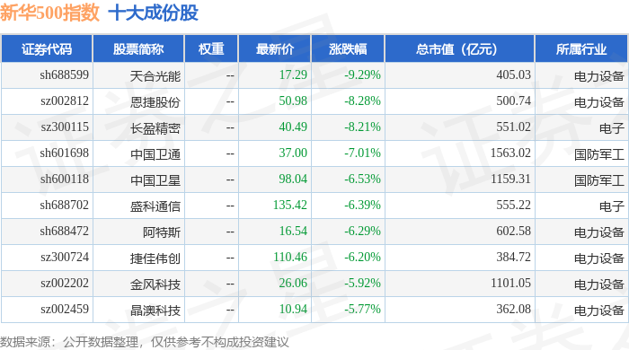 新华500(989001)指数十大成份股详情如下: