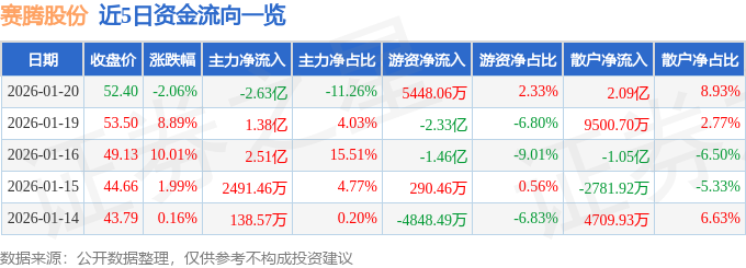 证券之星消息,截至2026年1月20日收盘,赛腾股份(603283)报收于52.4元,下跌2.06%,换手率16.37%,成交量44.4万手,成交额23.38亿元。