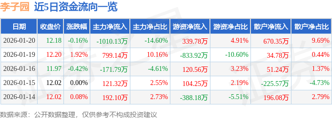 证券之星消息,截至2026年1月20日收盘,李子园(605337)报收于12.18元,下跌0.16%,换手率1.45%,成交量5.67万手,成交额6918.34万元。