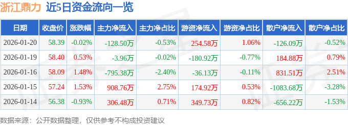 证券之星消息,截至2026年1月20日收盘,浙江鼎力(603338)报收于58.39元,下跌0.02%,换手率0.82%,成交量4.14万手,成交额2.41亿元。