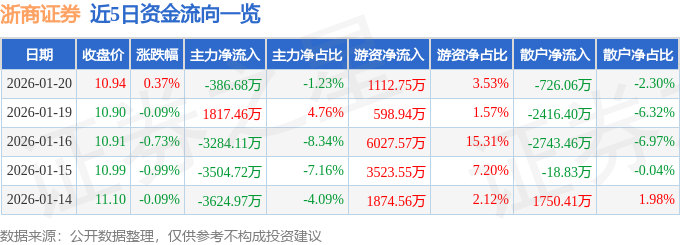 证券之星消息,截至2026年1月20日收盘,浙商证券(601878)报收于10.94元,上涨0.37%,换手率0.63%,成交量28.9万手,成交额3.15亿元。