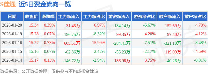 证券之星消息,截至2026年1月20日收盘,S佳通(600182)报收于15.34元,上涨0.39%,换手率1.25%,成交量2.12万手,成交额3246.31万元。