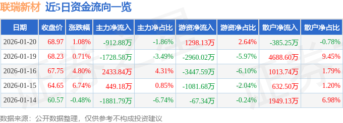 证券之星消息,截至2026年1月20日收盘,联瑞新材(688300)报收于68.97元,上涨1.08%,换手率2.96%,成交量7.15万手,成交额4.91亿元。