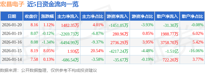 证券之星消息,截至2026年1月20日收盘,宏昌电子(603002)报收于8.16元,上涨1.12%,换手率3.98%,成交量45.17万手,成交额3.69亿元。