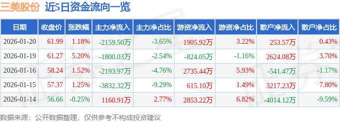 证券之星消息,截至2026年1月20日收盘,三美股份(603379)报收于61.99元,上涨1.18%,换手率1.58%,成交量9.67万手,成交额5.91亿元。