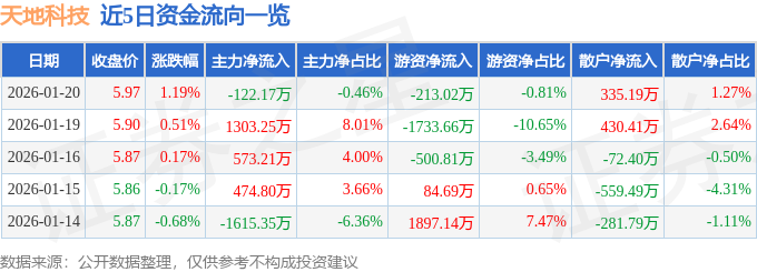 证券之星消息,截至2026年1月20日收盘,天地科技(600582)报收于5.97元,上涨1.19%,换手率1.07%,成交量44.39万手,成交额2.65亿元。