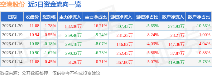 证券之星消息,截至2026年1月20日收盘,空港股份(600463)报收于11.08元,上涨1.28%,换手率1.65%,成交量4.94万手,成交额5443.28万元。
