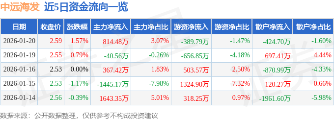证券之星消息,截至2026年1月20日收盘,中远海发(601866)报收于2.59元,上涨1.57%,换手率1.06%,成交量103.2万手,成交额2.65亿元。