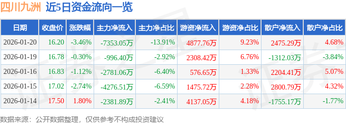 证券之星消息,截至2026年1月20日收盘,四川九洲(000801)报收于16.2元,下跌3.46%,换手率3.18%,成交量32.29万手,成交额5.29亿元。