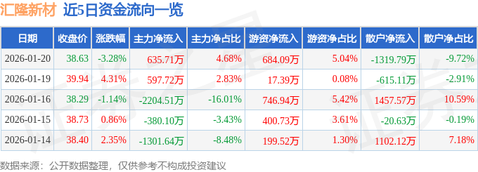 证券之星消息,截至2026年1月20日收盘,汇隆新材(301057)报收于38.63元,下跌3.28%,换手率4.17%,成交量3.45万手,成交额1.36亿元。