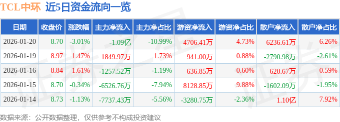 证券之星消息,截至2026年1月20日收盘,TCL中环(002129)报收于8.7元,下跌3.01%,换手率2.81%,成交量113.7万手,成交额9.96亿元。
