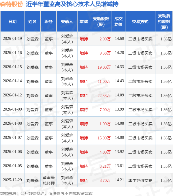 森特股份近半年内的董监高及核心技术人员增减持详情如下: