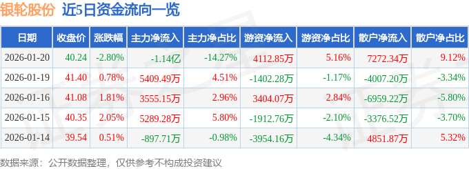 证券之星消息,截至2026年1月20日收盘,银轮股份(002126)报收于40.24元,下跌2.8%,换手率2.49%,成交量19.71万手,成交额7.98亿元。
