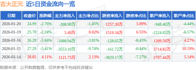 证券之星消息,截至2026年1月20日收盘,吉大正元(003029)报收于24.99元,下跌2.76%,换手率4.88%,成交量8.46万手,成交额2.14亿元。