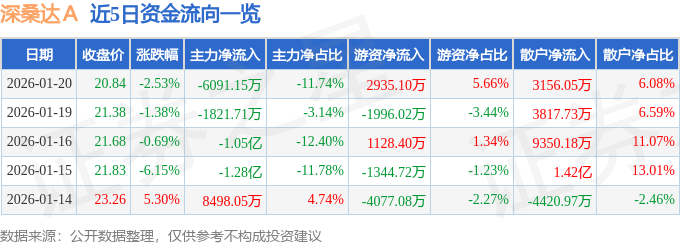 证券之星消息,截至2026年1月20日收盘,深桑达A(000032)报收于20.84元,下跌2.53%,换手率2.18%,成交量24.81万手,成交额5.19亿元。