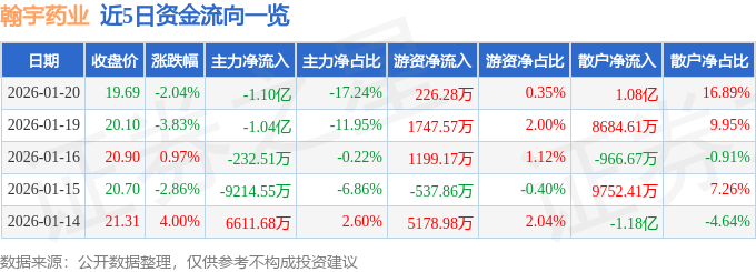 证券之星消息,截至2026年1月20日收盘,翰宇药业(300199)报收于19.69元,下跌2.04%,换手率4.34%,成交量32.34万手,成交额6.4亿元。
