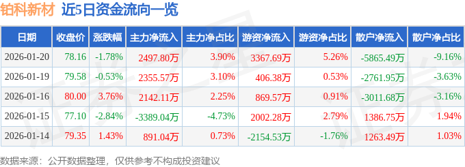 证券之星消息,截至2026年1月20日收盘,铂科新材(300811)报收于78.16元,下跌1.78%,换手率3.44%,成交量8.17万手,成交额6.4亿元。