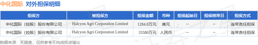中化国际1月19日披露2笔对外担保,被担保方为Halcyon Agri Corporation Limited。对外担保明细如下表: