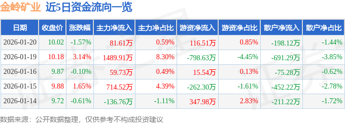 证券之星消息,截至2026年1月20日收盘,金岭矿业(000655)报收于10.02元,下跌1.57%,换手率2.32%,成交量13.82万手,成交额1.37亿元。